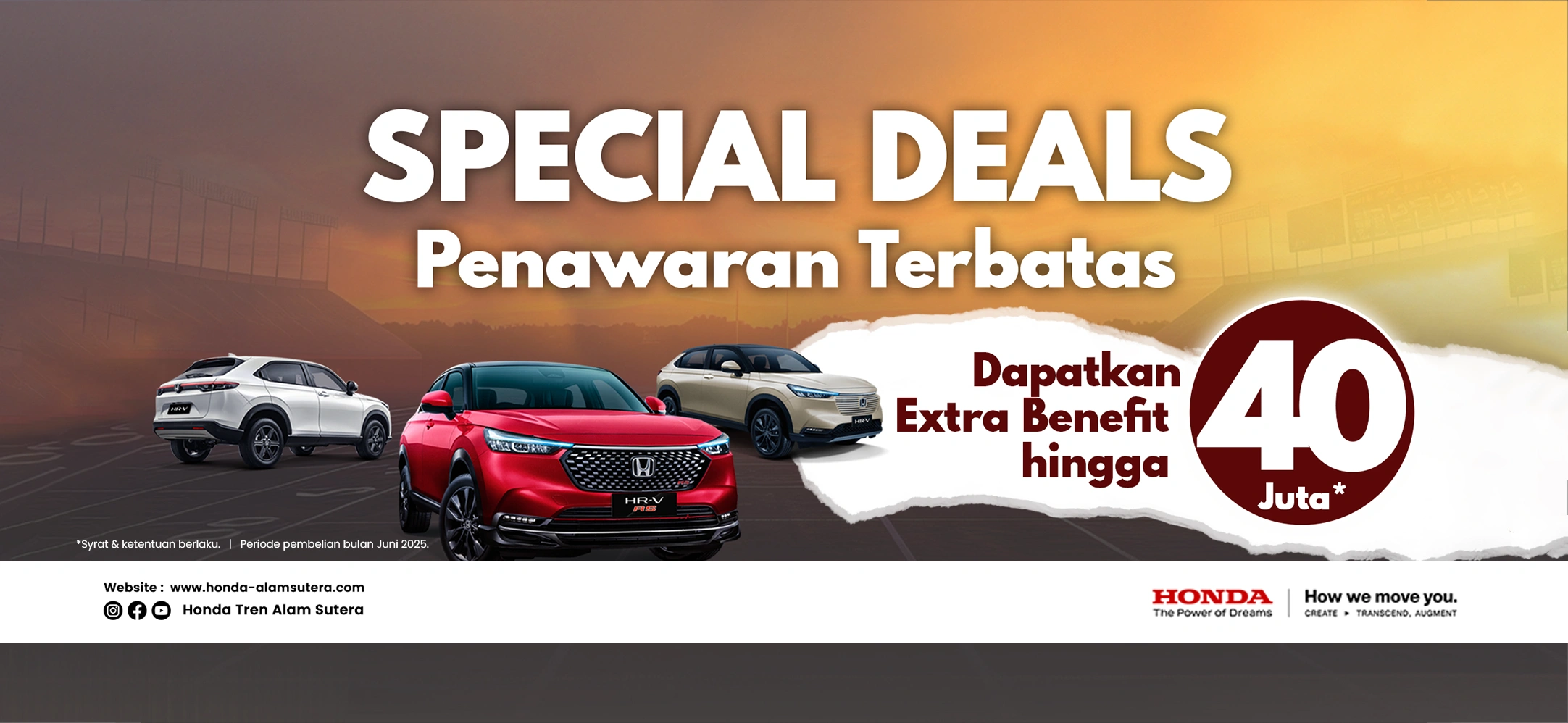 Nikmati Extra Benefit hingga 40 juta Rupiah!*. Khusus buat kamu yang berdomisili di area Jabodetabek, langsung hubungi Dealer resmi Honda Tren Alam Sutera dan wujudkan impian punya HR-V sekarang juga.