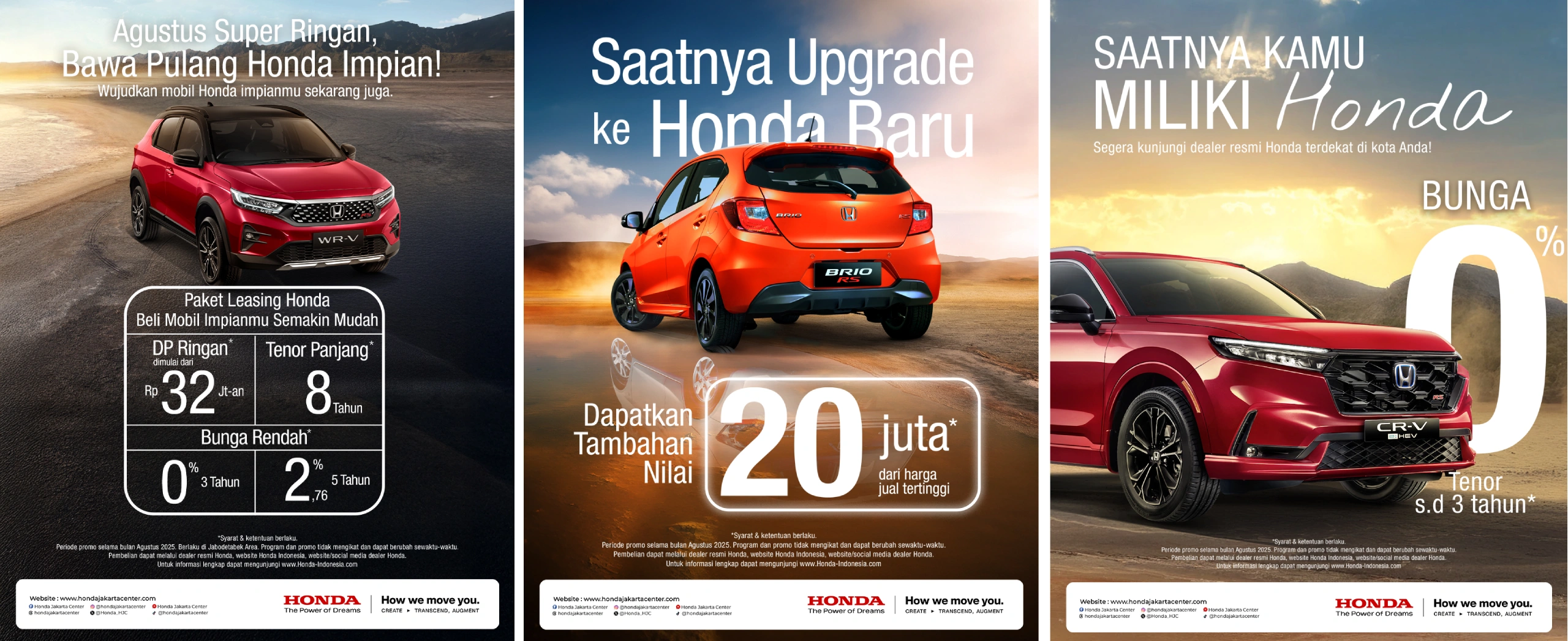 *Syarat & ketentuan berlaku. Periode promo selama bulan Agustus 2025. Program dan promo tidak mengikat dan dapat berubah sewaktu-waktu. Pembelian dapat melalui dealer resmi Honda, website Honda Indonesia, website/social media dealer Honda. Untuk informasi lengkap dapat mengunjungi www.Honda-Indonesia.com